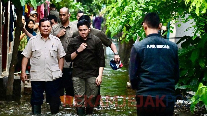 Dari beberapa foto yang diunggah, terlihat Prabowo menyusuri rumah-rumah warga yang masih tergenang. Prabowo berbincang dengan warga, bahkan juga sempat mencium bayi yang tengah digendong orang tuanya.